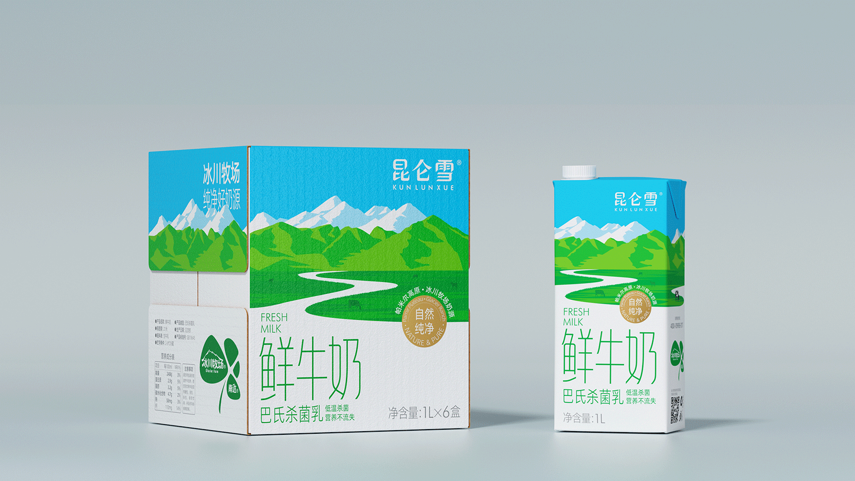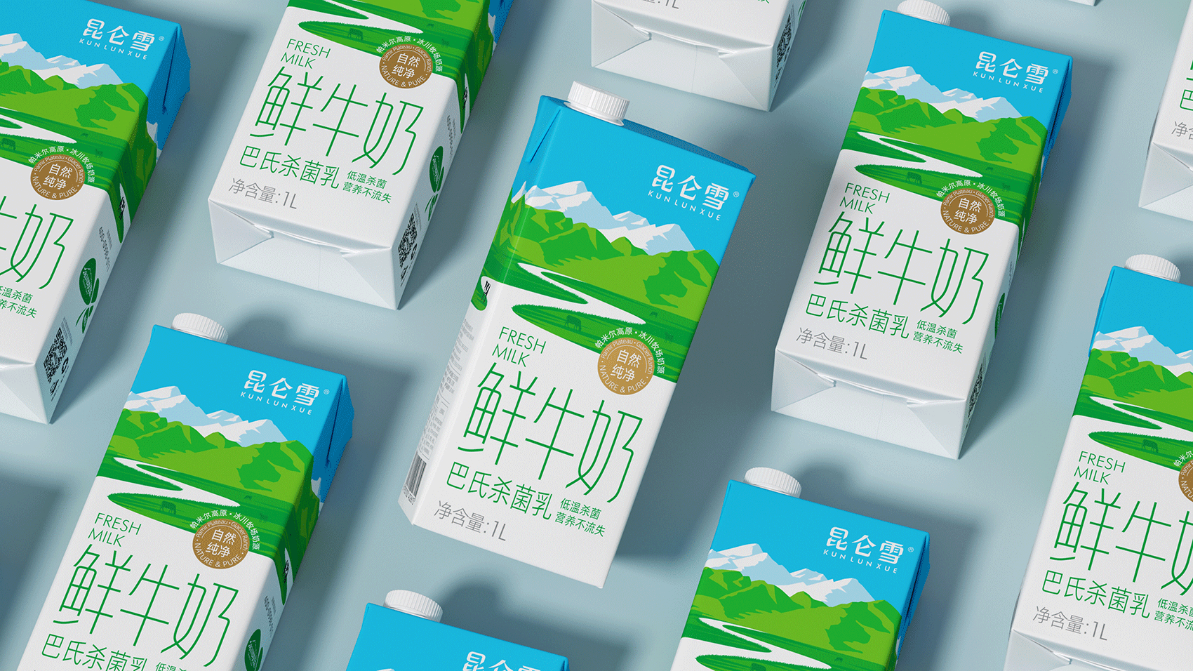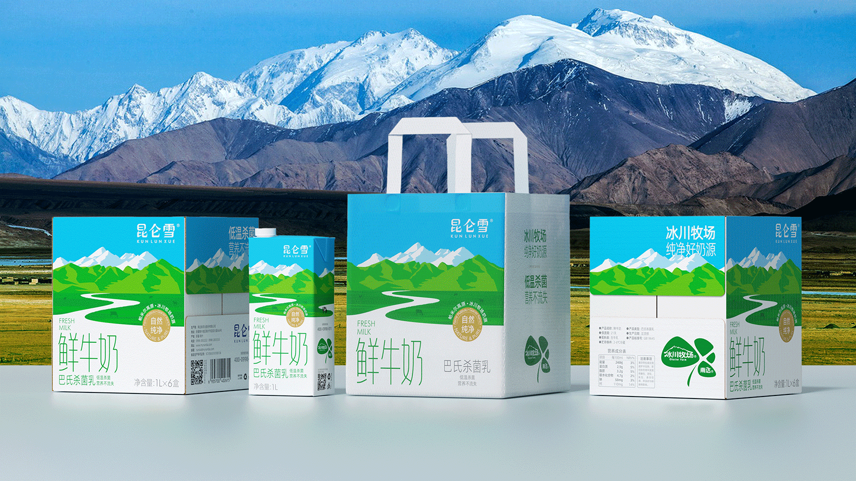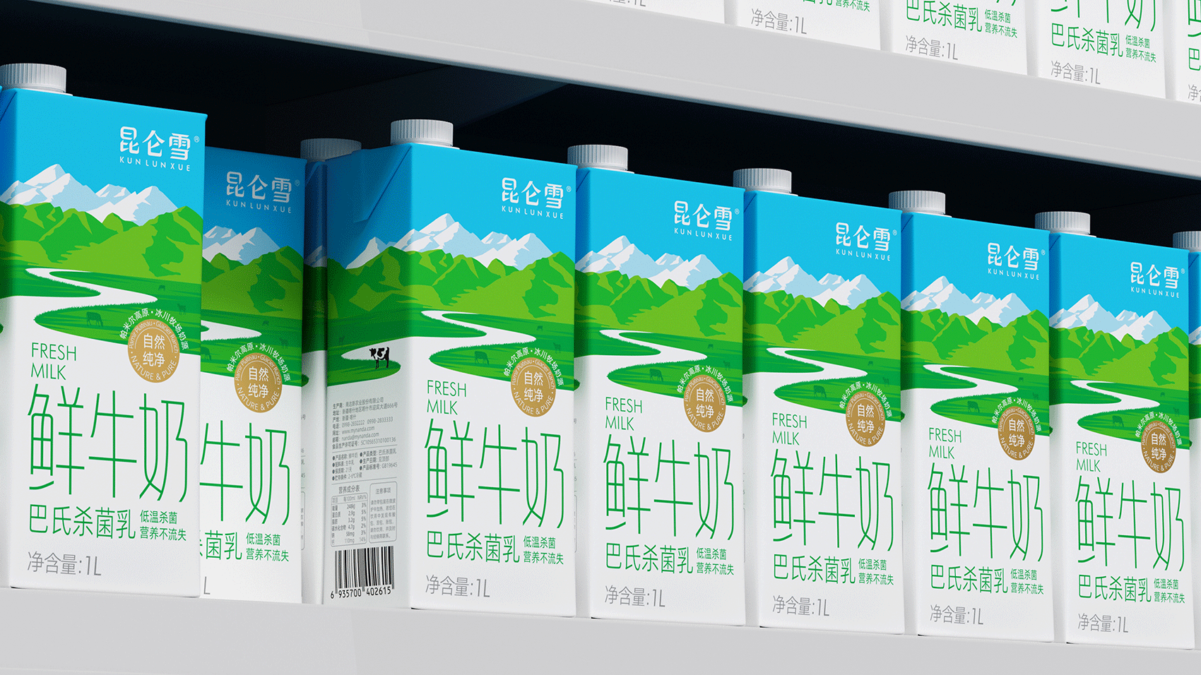 昆仑雪 鲜牛奶 昆仑雪鲜牛奶 源自昆仑山脉西端帕米尔高原冰川牧场奶源,采用巴氏低温杀菌,营养不流失。将“冰川融水流入牧场”的核心概念形象体现其中,与品牌名称进行了深刻的互动,赋予产品更为形象的价值联想。 |