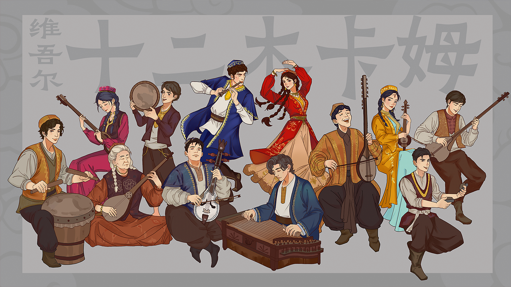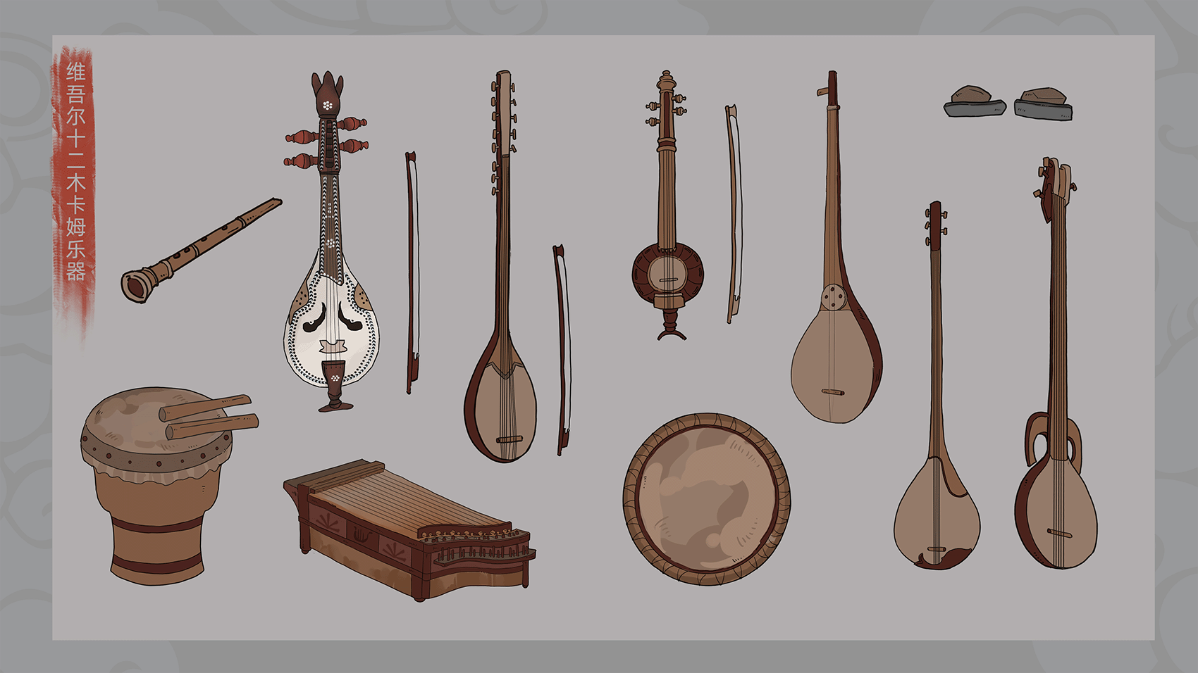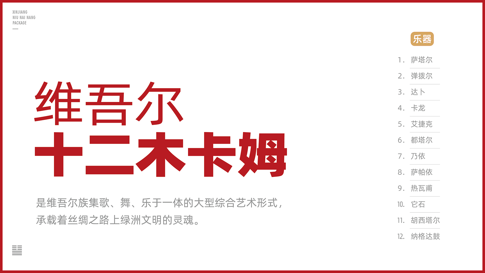 主题:维吾尔十二木卡姆 维吾尔十二木卡姆是维吾尔族集歌、舞、乐于一体的大型综合艺术形式,承载着丝绸之路上绿洲文明的灵魂。 乐器:萨塔尔、弹拨尔、达卜、卡龙、艾捷克、都塔尔、乃依、萨帕依、热瓦甫、它石、胡西塔尔、纳格达鼓。